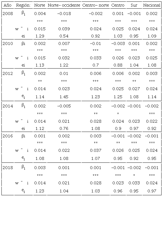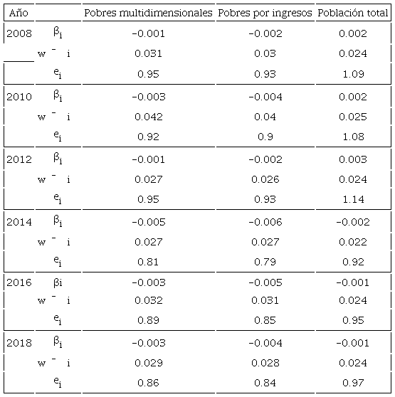 El comparativo de las elasticidades estimadas a nivel regional y por condición de pobreza para el periodo 2008-2018 se ofrecen en los Cuadros 3 y 4. Se indican tanto los βi del ingreso (efectos marginales sobre la variable observada estrictamente positiva en el modelo), como la media de la proporción del gasto en salud () y la elasticidad (ei).