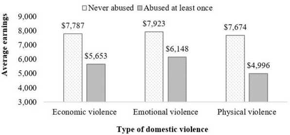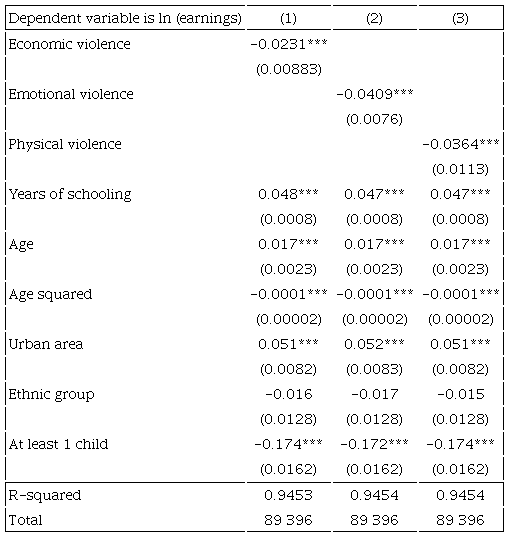 Very few empirical studies have analysed the relationship between earnings and domestic violence. One of the earliest papers studies two Latin American countries, Chile and Nicaragua (Morrison and Orlando, 1999). Findings indicate domestic abuse is related to lower women’s monthly earnings. Abused women in Chile and Nicaragua earn, on average, 34% and 46% less -respectivelythan women who have never been exposed to IPV. Although the authors mention the results using different types of domestic violence show a negative and significant effect on earnings, they do not provide any additional information to identify the type of violence with the strongest negative impact on earnings.