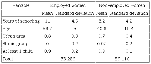 On average, employed women accumulate more years of education than do non-employed women and are slightly younger in the sample. 89% of employed women and 74% of non-employed women live in urban areas whereas 4% of employed women and 7% of non-employed women belong to an ethnic group. In terms of children, 93% of employed women have at least 1 child compared to 96% of non-employed women.