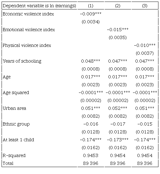 where the subscript i refers to women and i = 1, ..., n; LnWi is the natural logarithm of earnings,11Edi is the number of years of schooling and Agi and Agi2 represent the woman’s age and its square. In addition, three binary variables denoting if the woman i lives in an urban area Ari = 1, belongs to an ethnic group Eti = 1 and has had at least one child Chi = 1, are included. Finally, Dvi is the intimate partner violence variable. Three different specifications of (1) are estimated using ordinary least squares according to each type of IPV: economic, emotional and physical; and within each specification, estimations are performed using the three alternative measures of intimate partner violence discussed previously in section 3.1, an index variable, a binary variable and an indicator variable with three categories.