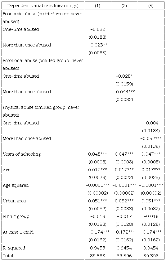 Another alternative to estimate the association between IPV and women’s earnings is to create an indicator variable. Following this approach, women never abused, women abused only one time and women abused more than once are classified in three different groups. The results obtained are presented in table 5.