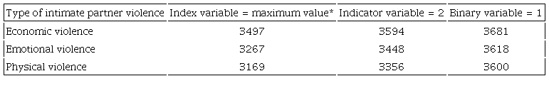 Domestic violence is classified in three different types: economic, emotional, and physical, according to a particular set of questions for each classification.5 All questions have three possible outcomes identifying how frequently the woman has experienced that particular abuse in the last 12 months from her partner: more than once, only once or never.6 One variable is created for every question. If the woman has never suffered the abuse stated in the question, the variable takes the value of 0; if she has suffered that abuse one time, the variable takes the value of 1; and if she has been abused in that way more than once, the variable takes the value of 2. Once a variable with three levels (0, 1, or 2) is created for each question, the next step is to obtain the violence magnitude by adding up the different levels by question within each type of domestic violence.
