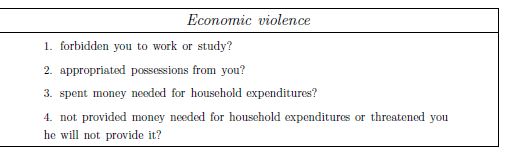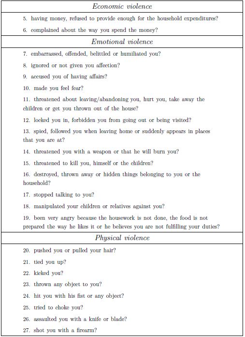 In addition, for each type of domestic violence, estimations are performed using the traditional binary variable that takes the value of one if the woman has responded “one time” to at least one of the questions identifying that type of domestic violence or taking the value of zero if she has responded “never abused” to all the questions.