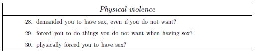 Domestic violence studies are typically conducted using as a measure of IPV an indicator with only two options, abused or not abused. Erten and Keskin (2018) provide an interestingly different approach to analyse the effect of education on domestic violence in Turkey. Although the standardized IPV index developed does not capture different levels of violence inflicted, it is a remarkable introduction to the traditional measure of domestic violence used in the literature. It also provides the basis for the IPV indicator proposed in this paper, further explained in section 3.1.