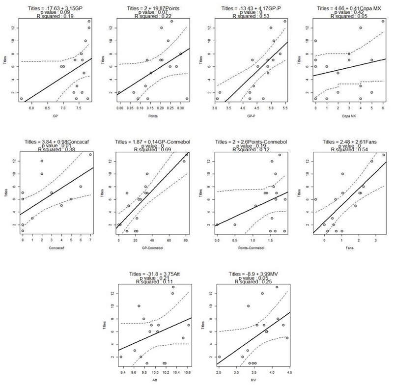 It is interesting to study the relationship between each variable considered in this work with the variable Titles to verify whether all features are positively and significantly related to the championships. Figure 1 shows the results for each pair of linear regressions between Titles and the rest of the variables considering results until Apertura 2019.13