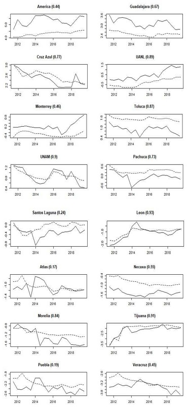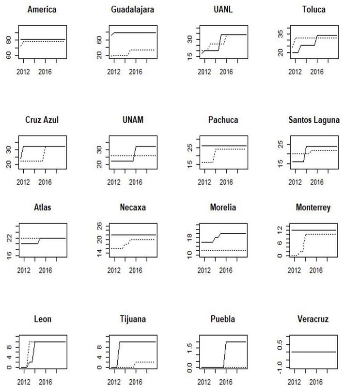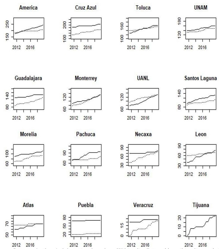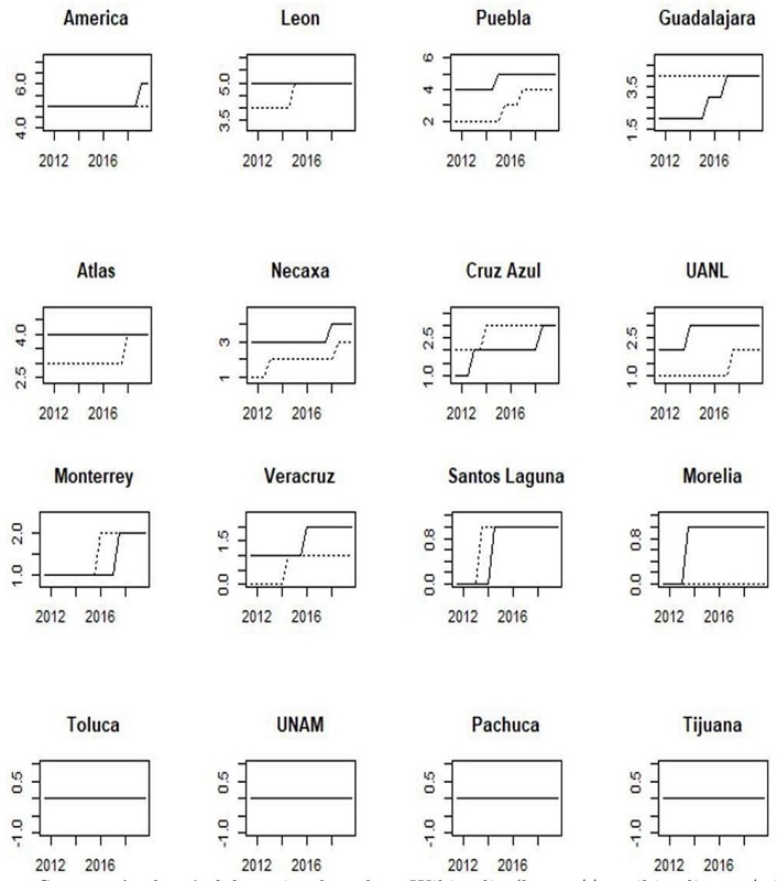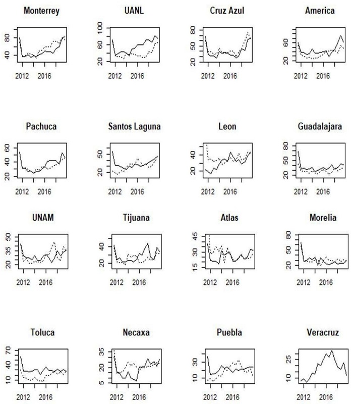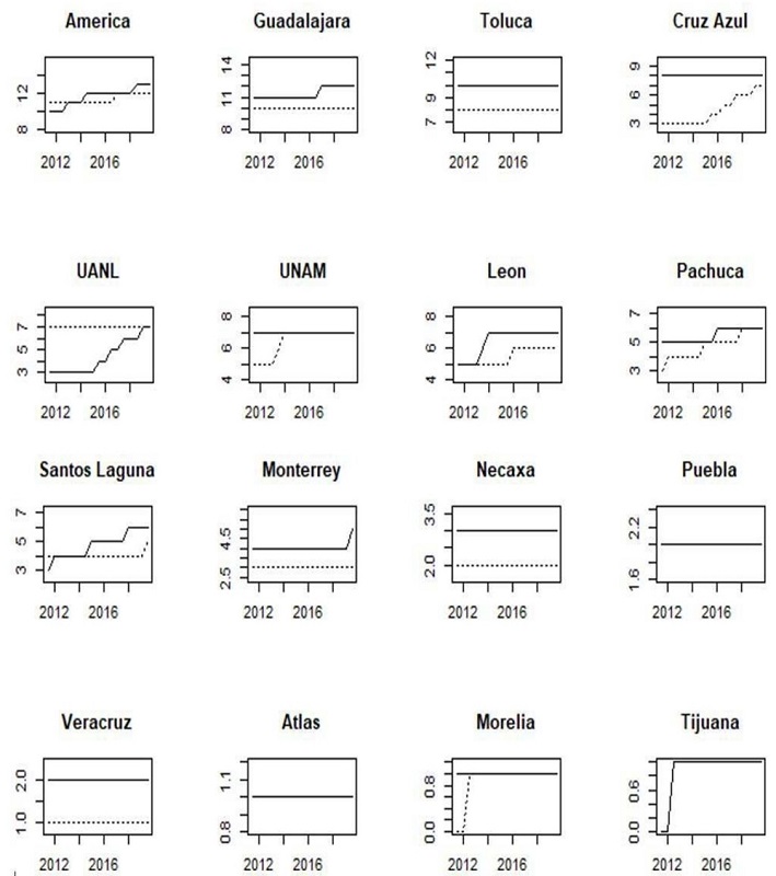 Currently, UANL tends to be the “the fourth big team”, followed by Monterrey, while Toluca and UNAM have a similar performance. Before 2017, Toluca and UNAM had a better performance than UANL and Monterrey. Consequently, the measures tend to have changed.