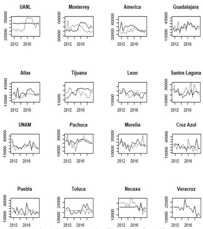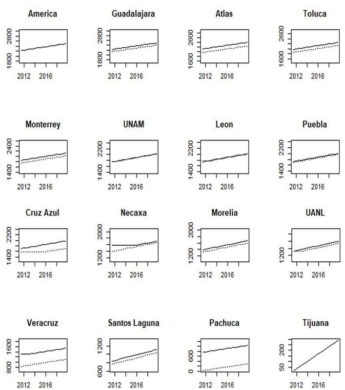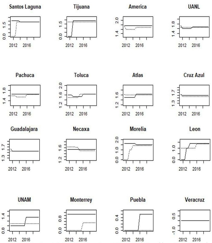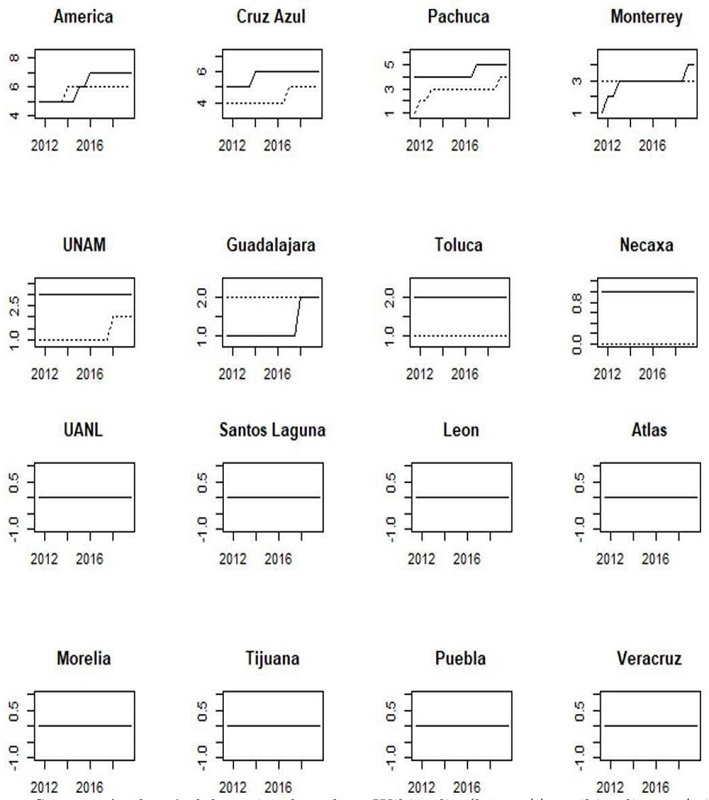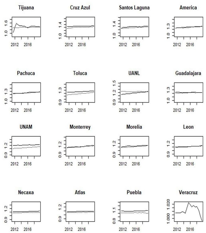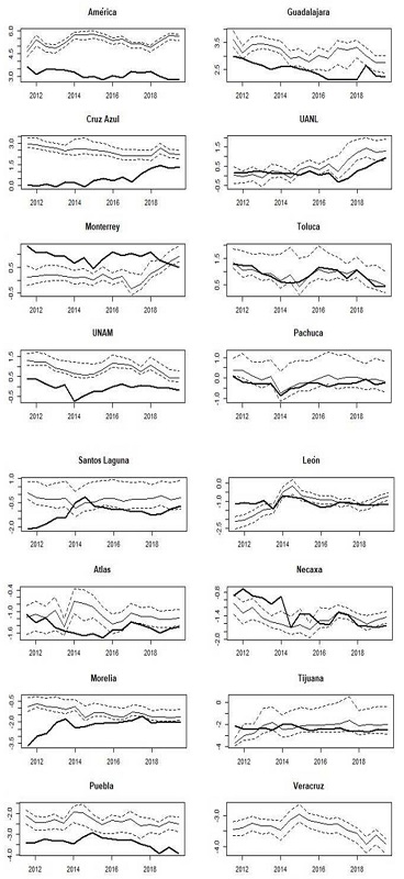 Currently, UANL tends to be the “the fourth big team”, followed by Monterrey, while Toluca and UNAM have a similar performance. Before 2017, Toluca and UNAM had a better performance than UANL and Monterrey. Consequently, the measures tend to have changed.