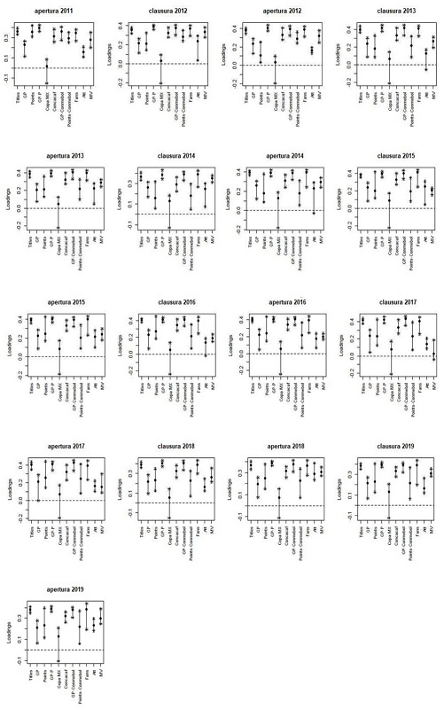 We detect the number of principal components that summarizes this information for all competitions, concluding that with one factor, we can represent the original variability of the dataset at all the time, which facilitates the interpretation of the results. The factor loadings indicate that the most important variables are the games played in play-offs, the domestic titles, the games played in CONMEBOL, and the popularity. Also, the market value of the franchises tends to be relevant. On the other hand, the smallest important variable is the number of titles in Copa MX. Thus, América is the greatest team in Liga MX, followed by Guadalajara and Cruz Azul. A significant result indicates that UANL and Monterrey have overcome teams such as Toluca and UNAM. Note that this exercise shows the evolution of a greatness measure in Liga MX, allowing us to analyze the dynamic the teams along the time for a latent concept. We faced limitations in including financial and popularity measures since they are only available from 2010 and sporty data are available for every season since 1943. However, we consider that “greatness” should involve non-sporty data as well. The trade-off pays in favor of a shorter period but a much richer database that gives an added value relative to similar studies on sport economics.