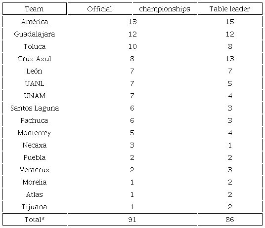 Discussion about which is the greatest, strongest, biggest, and most accomplished team in Mexican football (known as soccer in Australia, Canada, the United Kingdom, United States, among many others) is frequent in Mexican media. Most of the time, the discussion is mainly driven by preconceived ideas, feelings, or other idiosyncrasies of football commentators. In this way, the conclusions that usually arise are, more often than not, based on a shallow appreciation of the statistics concerning Liga MX (Professional Football Mexican League, First Division), considering only the historical titles or recent titles, the popularity among fans or the media time covered by journalists, so that conclusions reached in the media are based on a trivial analysis of a small number of variables.1 Consequently, sports commentators will pay asymmetrical attention to sporty measures as the number of domestic and international titles, number of play-offs, recent competitive performance, and some non-sporty indicators like the number of fans, media factor and the market value of the franchises. Hence, the opinion of sport commentators tends to be diffuse, as it lacks a statistical measure that incorporates the several elements that allows to conclude which team is the greatest in Liga MX. Our research pretends to fill this gap.