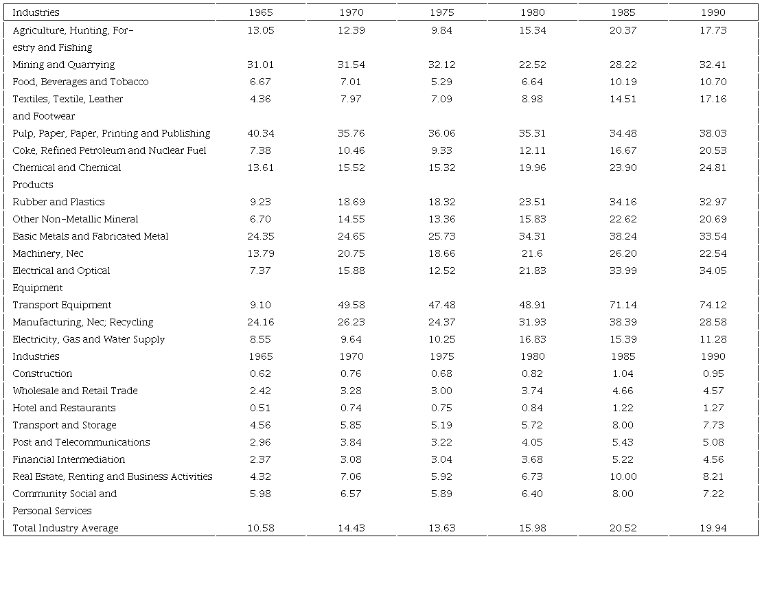 Most of the results on the industries with the highest indices should not be surprising since many of them can be associated with the maquiladoras in Mexico (Bergin et al., 2009), such as Textiles, Textile, Leather and Footwear, Electrical and Optical Equipment, and Transport Equipment. Furthermore, by comparing the results of 1980 and 1985, it is possible to observe how the dependency indices of all Mexican industries increased during 1985 and, in some cases, increased by more than 10%. These results clearly show the establishment of the gradual opening of the economy during the 1980s.