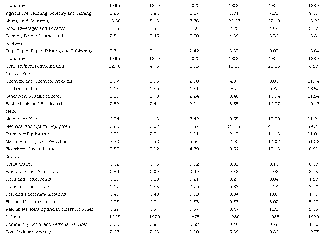 As in Canada’s trade relations with the USA, Mexico shows an upward trajectory in its dependence on the USA between 1965 and 1990. These results respond to the gradual opening of the economy during the 1980s. Besides, the three countries are neighbors and have comparative advantages to exploit. In addition, only one industry showed volatility in its dependence on the USA. Said industry was Coke, Refined Petroleum, and Nuclear Fuel, and an example of its volatility is that for 1965 it had an index of 12.76%; for 1970, an index of 4.06%; and for 1975, an index of 1.03%. Said decrease in the indices should be linked to the oil price shocks of the 1970s since the price per barrel in January 1970 was $3.35, and by the end of the 1970s, it was $32.50 per barrel (Hammes and Willis, 2005). However, the index had two increases, 15.16% in 1980 and 25.16% in 1985, to fall sharply to 8.53% in 1990.