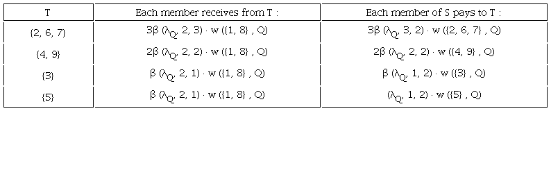 Notice that and in order to compute the payoff for player 1 or 8, one has to consider the transfers (associated to the coalition structure Q) between members of S and members of remaining coalitions (table 2).