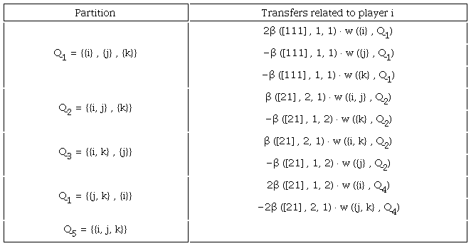 In partition {{1, 2} , {3}}, he/she receives (from player 3) 120 · and pays 40 · β ([21] , 1, 2).