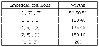 The value represents the payoff of coalition S, given the coalition structure Q forms. In this kind of game, the worth of some coalition depends not only on what the players of such coalition can jointly obtain but also on how the other players are organized. We assume that, in any game situation, the universal coalition N (embedded in would actually form, so that the players would have w to divide among themselves. But we also anticipate that the actual allocation of this worth would depend on all the other potential worths , as they influence the relative bargaining strengths of the players.