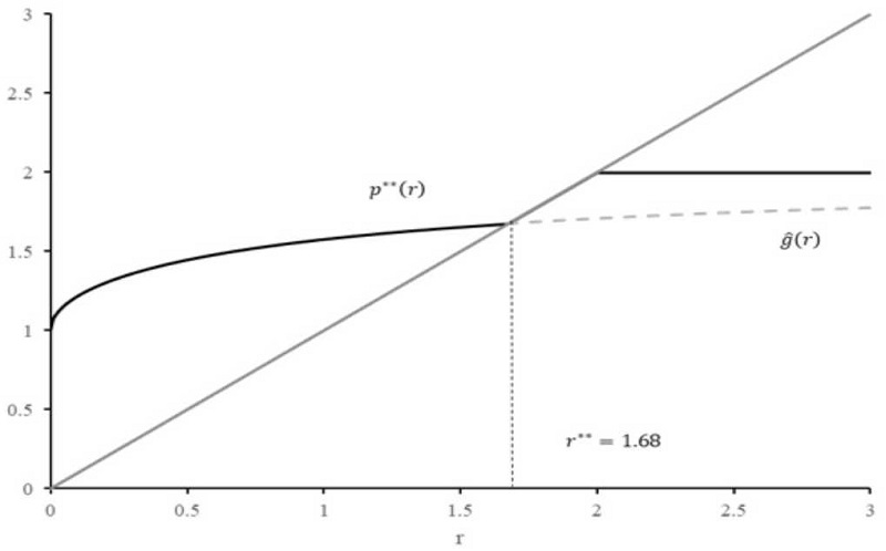 The zero-profit condition implies that the number of firms in the market will be a function of the model’s reference price and other parameters. Throughout the analysis, we assume that the number of firms is a continuous function instead of an integer. This assumption is useful to characterize the model’s equilibrium prices and perform comparative statics exercises. To characterize the number of firms endogenously determined in equilibrium, let us consider the first part of the firm’s profit function, which is defined for reference prices between 0 and 𝑟*. In this case, 𝑁 is equal to because of the zero-profit condition. By substituting the expression for N in the first line of the equilibrium price equation (7), we obtain . As in the case of Lemma 1, it is easy to show that the function is continuous and strictly increasing in the interval [0,∞), and its derivative satisfies for all 𝑟≥0. In addition, and as 𝑟→∞. Therefore, it is easy to show that the function must have a unique fixed point 𝑟** such that and . According to the characterization of the function and the application of the zero-profit condition, the endogenous number of the firm in equilibrium satisfies the following general form:
