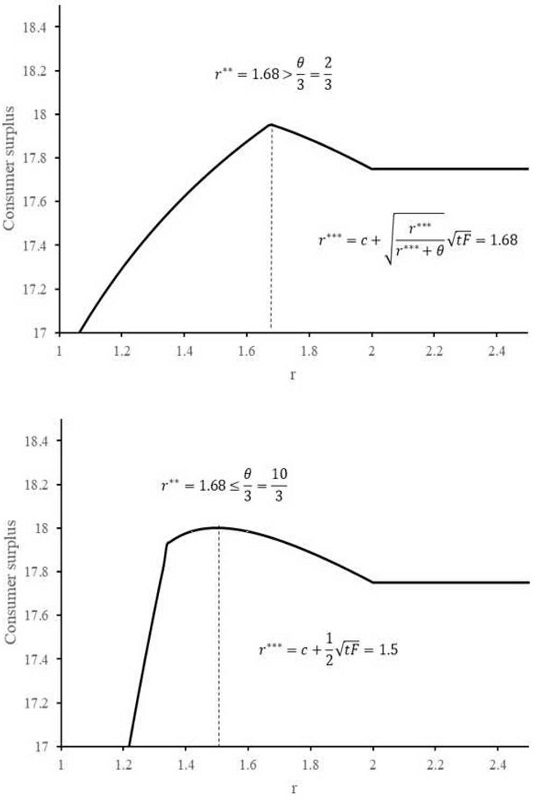 The equilibrium of the model is characterized by backward induction. In the third stage of the game, 𝑁>0 firms compete in prices taking the reference price chosen by the policymaker and consumer preferences as given. In this stage, equilibrium market prices are characterized as a function of the reference price 𝑟, the parameters of consumer preferences, 𝑡 and 𝜃; the marginal cost 𝑐 and the fixed number of firms 𝑁>0. In the game’s second stage, firms make their entry decisions, and a zero-profit condition determines the number of firms that enter the market. In this stage, equilibrium market prices and the number of firms are determined as functions of the reference price 𝑟 and the relevant parameters of the model 𝑐, 𝑡, 𝐹, and 𝜃. In the first stage, the policymaker chooses an optimal reference price 𝑟* ** taking the optimal behavior of firms and consumers in the next two stages as given. Basically, the policymaker calculates the consumer surplus, which coincides with the social surplus of the market because of firms’ free entry and chooses a reference price that maximizes the consumer welfare. Hence, the optimal reference price 𝑟* ** must depend on the parameters 𝑐, 𝑡, 𝐹, and 𝜃.