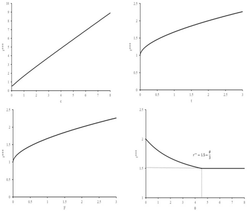 In the previous section, we showed that the optimal reference price increases as the parameters 𝑐, 𝑡, and 𝐹 increase. Since the equilibrium market price and the optimal reference price coincide, this result is consistent with a model with no reference prices. That is, the equilibrium market price must increase due to greater inefficiencies in production (associated with a high marginal cost), higher horizontal differentiation (associated with a high transportation cost), and higher entry cost for firms (high 𝐹).2 We also analyzed the case of an increase in the parameter 𝜃, which is associated with a greater sensitivity of consumers to the difference between the market price and the reference price. In this case, we also showed that an increase in the parameter 𝜃 is associated with a decrease in the equilibrium price whenever , otherwise an increase in the parameter 𝜃 has no effect on the equilibrium price. Intuitively, the fixed point 𝑟** defines a limit that fully characterizes the effect of an increase in the parameter 𝜃 of consumer preferences on the market’s equilibrium price. In this way, we say that 𝜃 is low enough when a variation in this parameter has a non-zero effect on equilibrium prices, i.e., whenever .