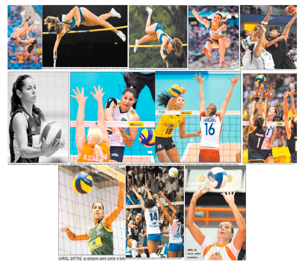 De entre el material empírico analizado en las modalidades publicadas fue el voleibol de sala y el atletismo los que tuvieron mayor número de inserciones fotográficas. Por ende, un hecho intrigante nos llamó la atención, pues a diferencia de lo que fue constatado por Romero y Pereira (2008), las jugadoras ahora tuvieron sus rostros expuestos. En el estudio realizado por ellos, con el fin de estudiar la jerarquía de género en la prensa deportiva, los autores verificaron que en todas las fotos relacionadas con la Superliga femenina disputada entre 2006 y 2007, el rostro de las atletas era sistemáticamente ocultado, o sea, era encubierto por la red. Mientras tanto otras partes del cuerpo, las consideradas más sensuales, se destacaban.