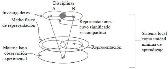Como señalamos, las representaciones materializadas en un medio físico constituyen el punto de encuentro de la comunicación interdisciplinaria, pero tienen además un importante papel en el proceso de aprendizaje en el laboratorio. Resultó útil referirse al sistema cognitivo: investigador (representación visual), equipo o medio físico que la soporta (véase esquema 1).
