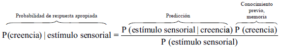 La lectura con base en las notaciones sería: la probabilidad de que una suposición sea correcta dado un estímulo sensorial, es igual a la probabilidad de ese estímulo sensorial dada la creencia, por la probabilidad de la creencia entre la probabilidad del estímulo sensorial.