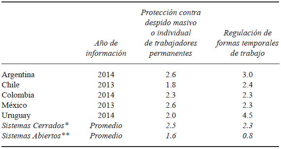 A esta primera se agrega un segundo clivaje: sistemas abiertos y cerrados en la provisión de posiciones en el mercado de trabajo (Sorensen, 1983). Los primeros están caracterizados por normas de contratación y despido muy flexibles, donde predomina el derecho individual del trabajo sobre el colectivo. En los segundos se ha ido construyendo una densa normativa que regula las condiciones de ingreso al empleo la efectivización (“tenure”) y restringen las causales de despido. Actualmente, estas ideas se operacionalizan mediante el índice de protección del empleo elaborado por la OECD (cuadro 1). Los sistemas cerrados tendrían un particular sesgo pro-edad y tendrían como consecuencia, por lo tanto, un alto nivel de desempleo entre los jóvenes (Breen & Buchmann, 2002).
