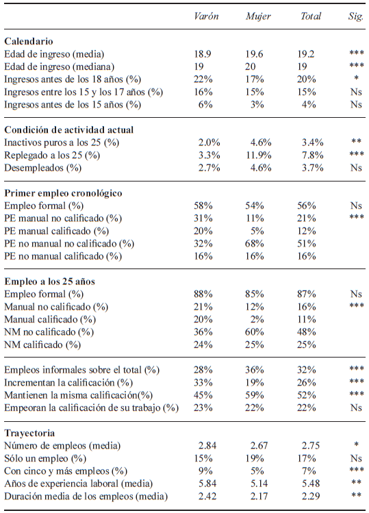 Esta sección cumple con un objetivo descriptivo y analítico. El cuadro 2 presenta promedios y porcentajes, desagregados para varones y mujeres, como resumen para el conjunto de variables seleccionadas como descriptivas del ingreso al mercado de trabajo, del actual empleo y de la trayectoria laboral hasta los 25 años.