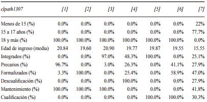 Las trayectorias números 4, 5 y 6 implicaron una modificación de las cualificaciones en la transición. La primera se caracteriza por un proceso descendente, con una baja edad de ingreso (19 años), con empleos de menor duración (año y medio), predominando quienes completan esta transición con empleos protegidos. Sin embargo, si se observa el dendrograma de 14 clusters, esta gran trayectoria tiene tres subgrupos, donde dos de ellos han comenzado su vida laboral en empleos informales.
