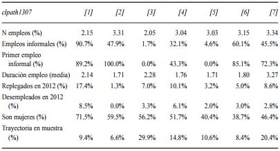 Para finalizar, es de notar que tanto tres de cada cuatro desempleados e inactivos con experiencia (“replegados”), son agrupados en dos trayectorias, las números 1 y 4. No han recorrido trayectorias inequívocas o excepcionales frente a quienes están activos o empleados.