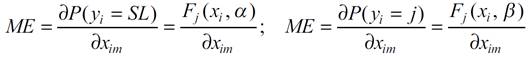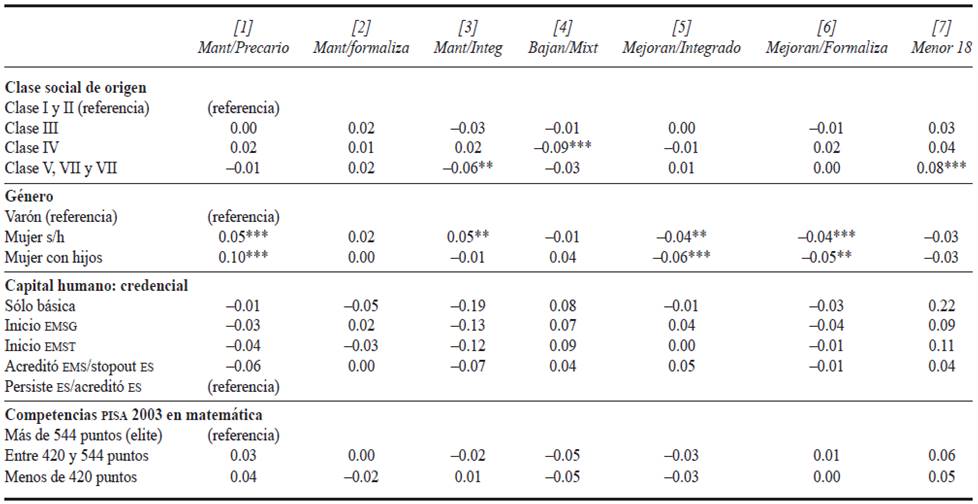 Como los parámetros de los modelos de logístico multinomiales son difíciles de interpretar directamente, también presentamos los efectos marginales de las variables de interés (Cameron & Trivedi, 2010). Es decir, estimamos el efecto de un cambio en la m-ésima variable sobre la probabilidad de que el individuo esté en el j-ésimo tipo de trayectoria que resulta de interés: