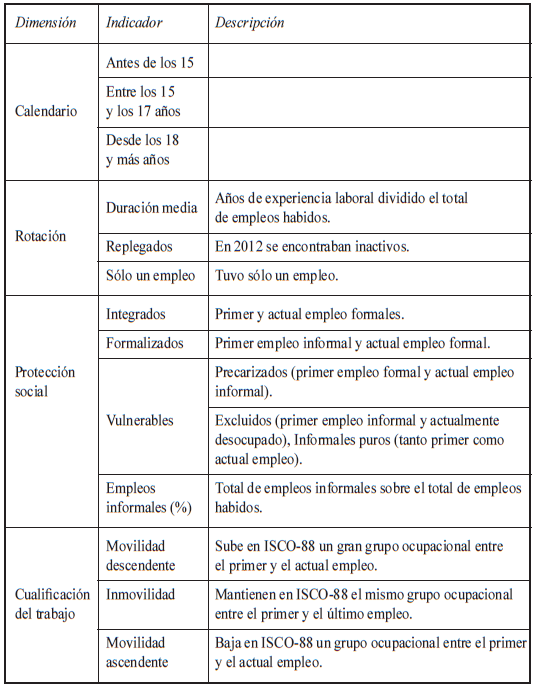 El análisis de cluster utiliza 13 indicadores relativos a las dimensiones de calendario, formalidad y cualificación del trabajo. El esquema 1 presenta las definiciones operacionales. Su combinación representaría un espacio teórico de 72 posibles trayectorias.