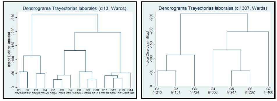 Se realizaron quince análisis de cluster, variando la cantidad y la especificación las variables. Las diferencias halladas refirieron a determinar si el inicio laboral antes de los 18 años implicaba una o dos trayectorias, y respecto a la “pureza” del grupo en cuanto a la movilidad descendente o ascendente en las cualificaciones del trabajo a lo largo de la trayectoria. Estos aspectos hacen variar la solución óptima entre siete, nueve o 10 clusters. Sin embargo, cuatro clusters fueron reiteradamente identificados por todas las soluciones. Sobre estos antecedentes y procurando mayor claridad analítica, se optó por la solución número 13, que sólo usó medidas dicotómicas. La prueba de Duda-Hart avala una solución óptima de siete clusters que adoptaremos; aunque también son aceptables la solución de 10 y una de 14. El esquema 2 presenta los dendrogramas para 14 y siete grupos, en tanto que el cuadro 3 muestra los valores de la regla de Duda.
