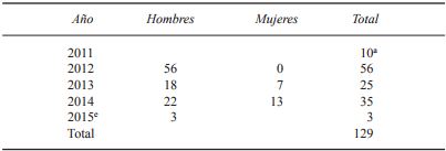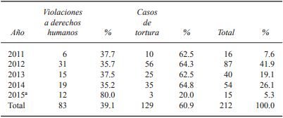 Como se puede apreciar, los casos de tortura comprenden 60% de las violaciones a derechos humanos. Cabe hacer notar que los registros del año 2011 inician en el último trimestre de ese año. Igualmente, 2015 sólo muestra el primer trimestre, por eso los casos de tortura representan 20%. El mayor número de casos lo muestra el año 2012, con 87 registros.