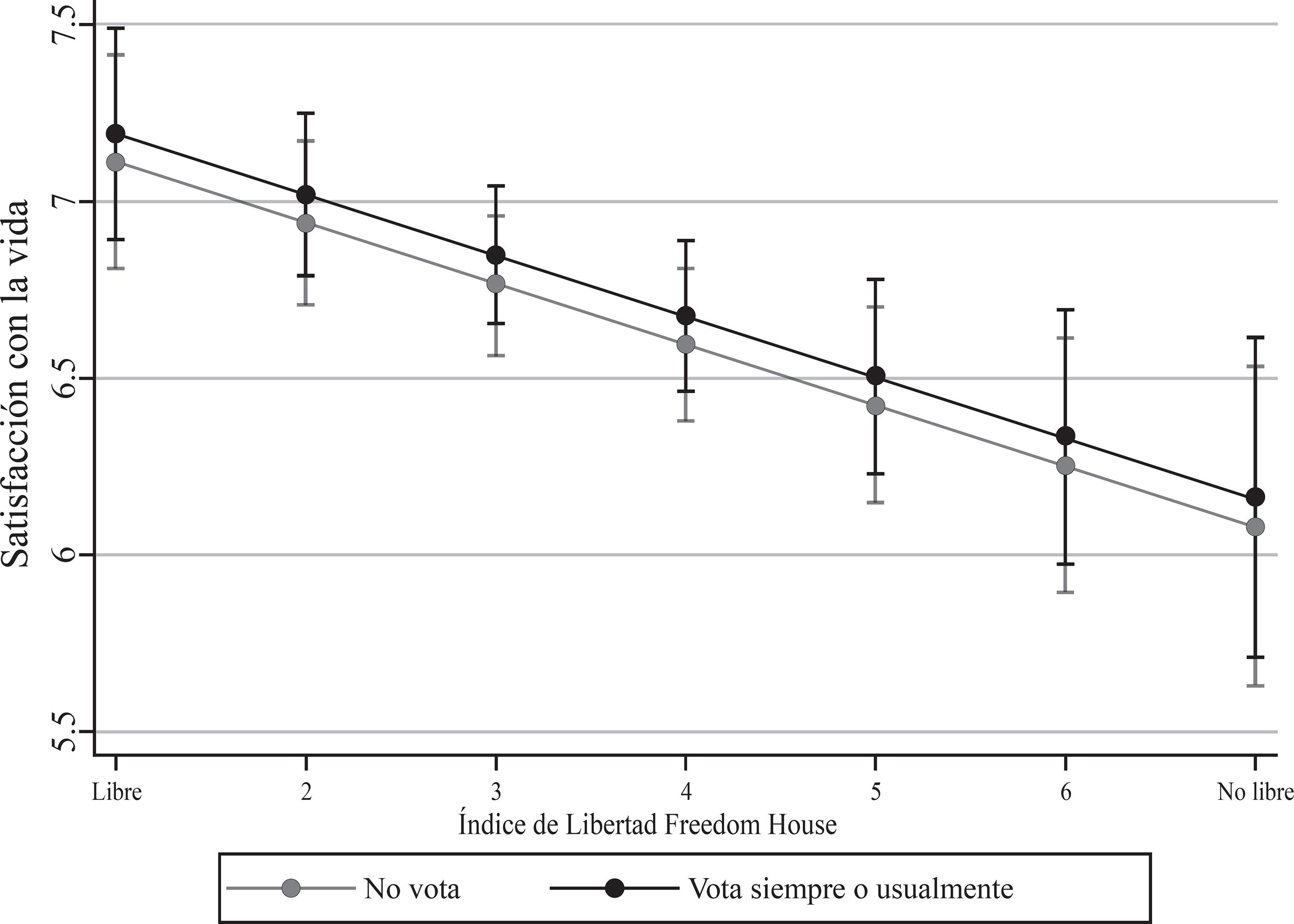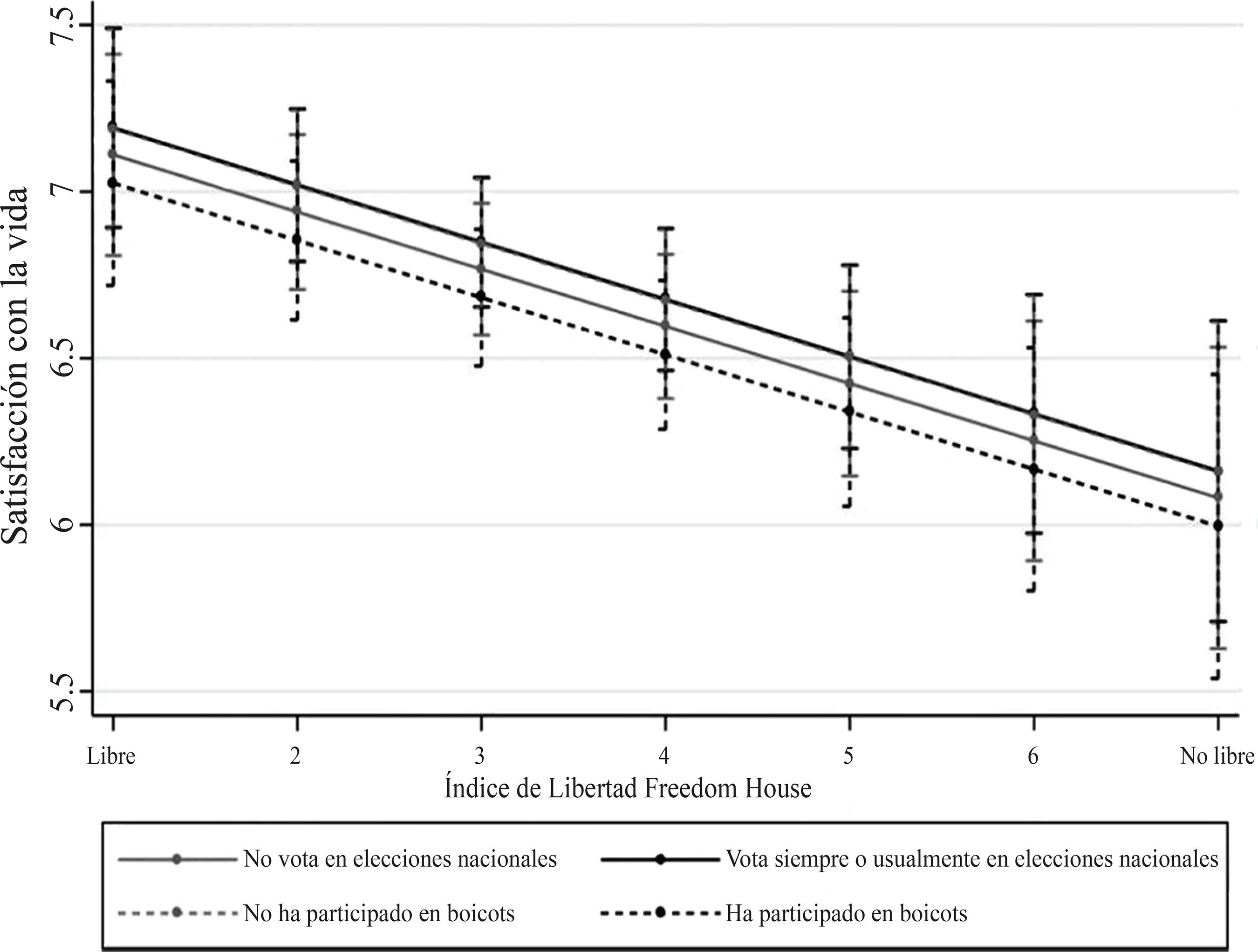 El gráfico 1 muestra la predicción lineal de la satisfacción con la vida para las dos categorías de la variable voto (no vota y vota siempre o usualmente) y los valores del índice de libertad de Freedom House. La relación positiva entre satisfacción con la vida y voto es mayor en los regímenes libres, según la categorización de Freedom House. Por otro lado, en el gráfico 2 pueden observarse las diferencias entre participar y no participar en boicots en relación con el bienestar subjetivo. La satisfacción con la vida tiene menores niveles cuando se ha participado en boicots y se vive en un contexto de régimen no libre. Es importante destacar que las diferencias en la predicción entre las categorías de las variables de participación son mayores en el caso de los boicots, que representan una forma no convencional y conflictiva de participación. Lo anterior se ilustra mejor en el gráfico 3, donde se muestran las distintas categorías para las variables de participación política. Este gráfico muestra que la asociación entre no participar en boicots y votar siempre o usualmente en las elecciones es bastante similar, mientras que las diferencias más amplias pueden observarse en la participación en boicots y no votar. Todo lo anterior se analiza en el contexto de libertad de los países, donde las relaciones entre bienestar subjetivo y todos los tipos de participación se ven atenuadas.