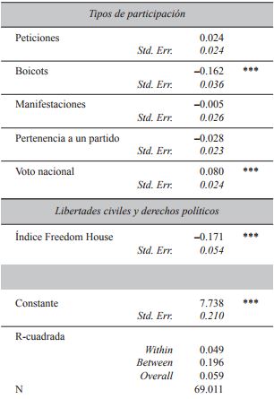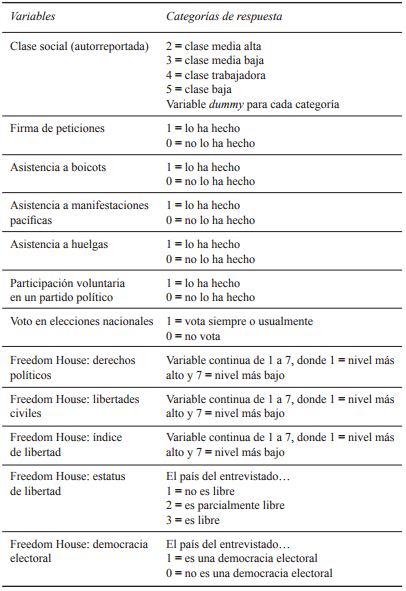La variable dependiente del modelo es la satisfacción con la vida medida a través de una variable cuyos valores van de 1 a 10, donde los valores más altos son los que indican mayor satisfacción con la vida. Las variables independientes de interés incluidas en el modelo son variables de participación política convencional, como el voto, la firma de peticiones y la pertenencia a un partido político que implica una participación no convencional, como manifestaciones y boicots. Los modelos controlan por variables sociodemográficas que la literatura especializada ha ubicado como determinantes del bienestar subjetivo, como edad, sexo, nivel socioeconómico, número de hijos, educación y estado civil. Dado que la variable independiente de interés es la participación política convencional o no convencional en países con tipos de régimen político radicalmente diferentes -y que por tanto se podrían esperar diferencias en la asociación atribuibles a los niveles de libertad política prevaleciente en cada uno de ellos-, se controla por el índice de libertad de Freedom House compuesto por una medición de derechos políticos y otra de libertades civiles (véase cuadro 1).