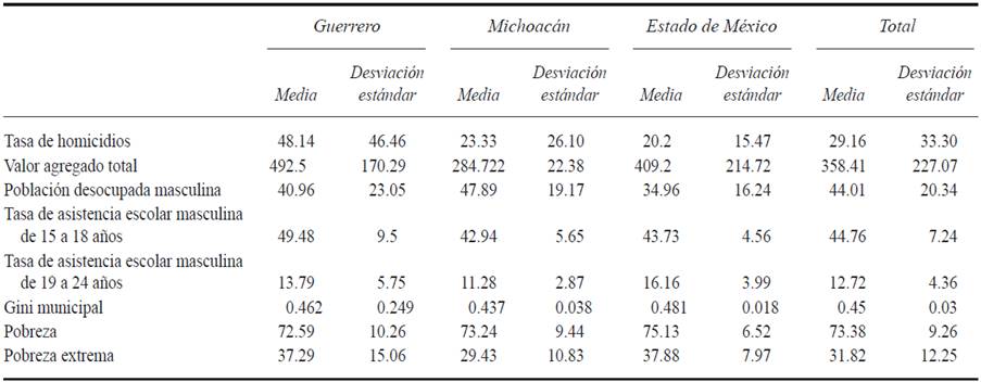 Antes de proceder con los resultados de las regresiones, muestro algunos datos y mapas descriptivos sobre las variables socioeconómicas de interés y su relación con los homicidios (todas las variables, codificación, tratamiento y fuente se encuentran en el anexo de este artículo). En el cuadro 1 se presentan las medias y las desviaciones estándar de las variables de interés, divididas entre las entidades donde se encuentran los municipios de Tierra Caliente. Como el lector observará, se confirma que los municipios guerrerenses de Tierra Caliente son los que sufren una tasa más alta de homicidios por cada 100 000 habitantes. Mientras tanto, en la variable valor agregado total, que representa el valor promedio de las actividades económicas en el municipio, medida en las encuestas y censos económicos de INEGI, Michoacán concentra la mayor parte de la actividad económica de la región, dejando atrás a los municipios de Guerrero y el Estado de México. Como se ve en otras variables socioeconómicas, como población desocupada masculina, variable elegida por su relevancia para explicar los homicidios de hombres jóvenes, Michoacán tiene mejores condiciones de desarrollo. Sin embargo, en cuanto a tasas de asistencia escolar, índice de Gini (que mide la desigualdad de ingreso) y pobreza, los municipios terracaleños de las tres entidades tienen tendencias estadísticas similares: alta pobreza, alta desigualdad y tasas de escolaridad relativamente bajas respecto a la media nacional. Es menester enfatizar que estas tendencias regionales se han sostenido en el tiempo. El aumento de la escolaridad ha sido relativamente lento y las tasas de pobreza se han mantenido constantes. También se registra un aumento de la desigualdad de 2005 a 2010, los únicos periodos donde hay información disponible del índice de Gini.