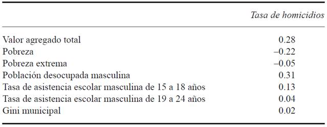Por último, en el cuadro 2 se ve la correlación entre las variables independientes de este estudio y la tasa de homicidios por cada 100 000 habitantes, calculada a partir de los datos del Sistema Nacional de Salud Pública de la Secretaría de Salud. Es notable que la población ocupada, el valor agregado total, la tasa de asistencia escolar masculina de 15 a 19 años y la población desocupada tienen una correlación mucho más fuerte con el aumento de la tasa de homicidios. En cambio, en el caso de la pobreza, ésta parece reducir la tasa de homicidios. Finalmente, en cuanto a la desigualdad de ingreso y la pobreza extrema, aparentemente no tienen una relación fuerte con la tasa de homicidios.