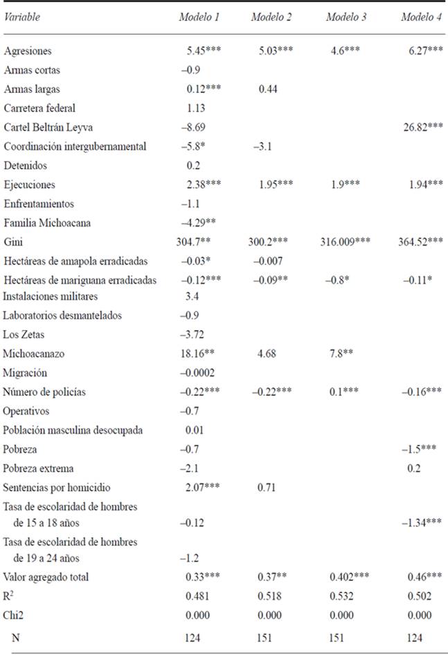 Como se notará, en los modelos se muestra que hay variables que corresponden a las tres teorías que resultan significativas en los cuatro modelos que se presentaron, a saber: el valor agregado total, nuestro indicador de actividad económica, el índice de Gini, que representa desigualdad del ingreso, las agresiones con arma de fuego, las ejecuciones y el número de policías. En particular, respecto a las teorías de los mercados ilegales, las agresiones y las ejecuciones respaldan la perspectiva del conflicto criminal, mientras que el número de policías describe un escenario de disuasión desde la visión racional, aunque se debe tomar con reservas esta información debido a la evidencia sobre la captura de gobiernos y policías locales por organizaciones criminales. En ese sentido, el número de policías podría ser un indicador de captura de una organización criminal. Por el lado de la teoría del control, los resultados robustos alrededor del índice de Gini (privación relativa) aportan a las investigaciones la relevancia de la desigualdad en la explicación de la tasa de homicidios en México. Finalmente, la variable de valor agregado total es significativa en todos los modelos, lo que confirma que las dinámicas económicas de desarrollo en la región, entre los mercados ilícitos de drogas y lícitos agroindustriales, sobre todo posteriores a la crisis económica global de 2008, establecieron una anomia institucional que sobrepuso al mercado por encima de las instituciones sociales. En particular, esto también confirma que los estudios regionales y focalizados permiten observar las condiciones de anomia y cómo afectan la tasa de homicidios.
