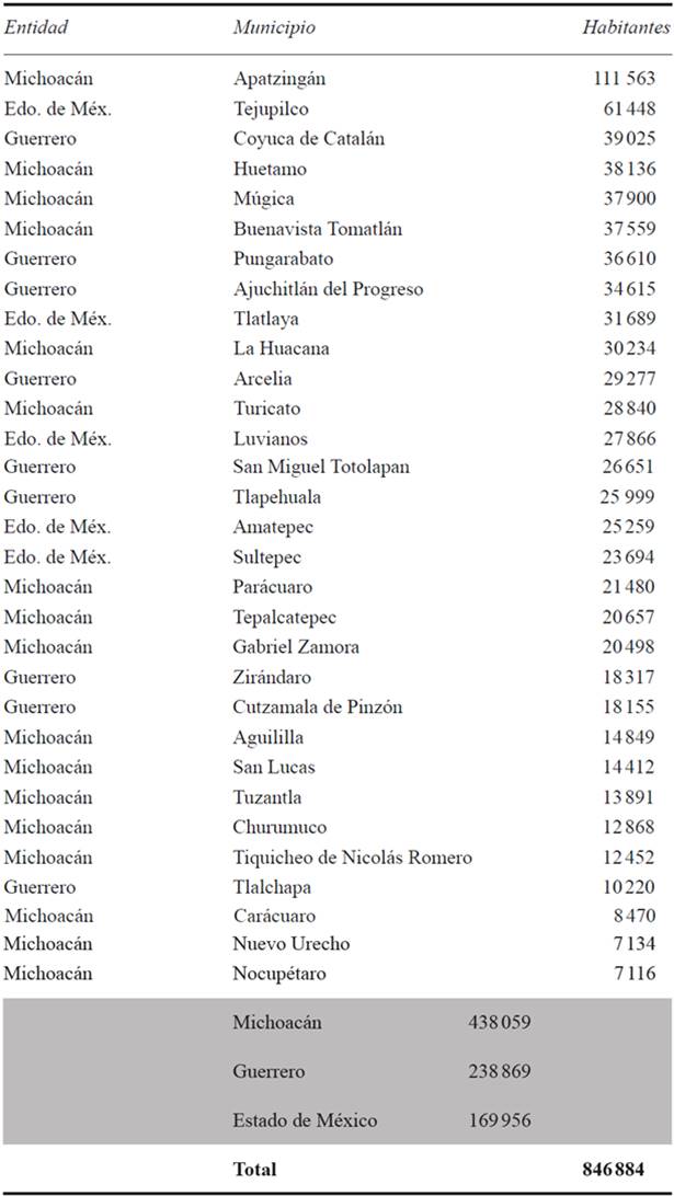 La Tierra Caliente está compuesta por 31 municipios articulados en la meseta que rodea las cuencas del río Balsas y el río Tepalcatepec, los cuales se encuentran entre la faja neovolcánica transmexicana al norte y la Sierra Madre del Sur (García Martínez, 2008), ubicados en tres entidades de la República, Michoacán, Estado de México y Guerrero (véase en el anexo la lista de municipios).