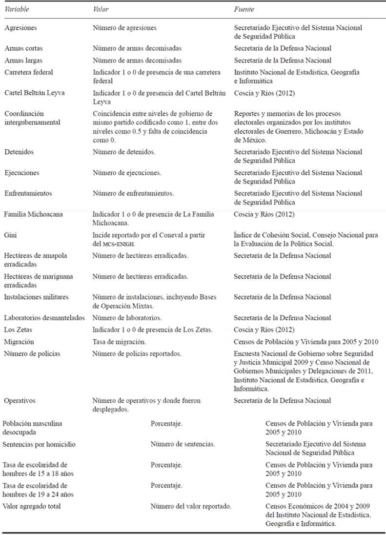 Los resultados de la regresión panel sobre la tasa de homicidios que presento más adelante prueba el efecto de estas variables, y usa como control las variables que se han utilizado en las investigaciones para el caso mexicano vinculadas de alguna manera con la literatura de violencia y mercados ilícitos (la descripción de las variables está en el cuadro 5, disponible en el anexo de este artículo). Vale la pena recordar que estas variables tratan de medir, desde fuentes oficiales en su mayoría, la presencia de actividades criminales, presencia de organizaciones criminales, la posibilidad de coordinación intergubernamental, detenciones y sentencias por homicidios, presencia de mercados ilegales de armas y drogas, número de policías, operativos militares y, en especial, un hecho que vale la pena registrar: la detención de alcaldes presuntamente cercanos a la Familia Michoacana en 2009, mejor conocida como “michoacanazo”. Igualmente, es pertinente aclarar que estos datos no contemplan ni el levantamiento de las autodefensas ni la intervención federal que siguió a dicho levantamiento.