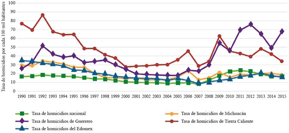 Estos municipios han tenido un lugar protagónico en el escenario nacional de la violencia en México y forman parte de una región históricamente violenta. Con el fin de observar su papel en la violencia en el país, en la gráfica 1 presento las tasas de homicidios por cada 100 000 habitantes en México, en las tres entidades que integran la Tierra Caliente y en los 31 municipios de la zona. Como se notará, de 1990 a 2004 hubo una reducción uniforme delos homicidios en el país, en las entidades y en la región, a la par que se registró un mayor crecimiento y escolaridad en la región. Esto es congruente con el argumento de Norbert Elias de la modernización (véase Eisner, 2001; Hernández Bringas, 1989; González Pérez et al., 2009), que sostiene que ésta reduce gradualmente el número de homicidios. No obstante, a partir de 2005, esta tendencia descendente del homicidio en todos estos lugares se revirtió, en particular en Michoacán y Guerrero. Aunque el aumento precedió a la intensificación de la persecución de las organizaciones criminales por el gobierno de Felipe Calderón, es claro que se agravó en años posteriores, sobre todo en Guerrero y en Tierra Caliente, que juntos superan por mucho el aumento de la tasa nacional de homicidios, y los años 2009 y 2012 se destacan como especialmente cruentos.