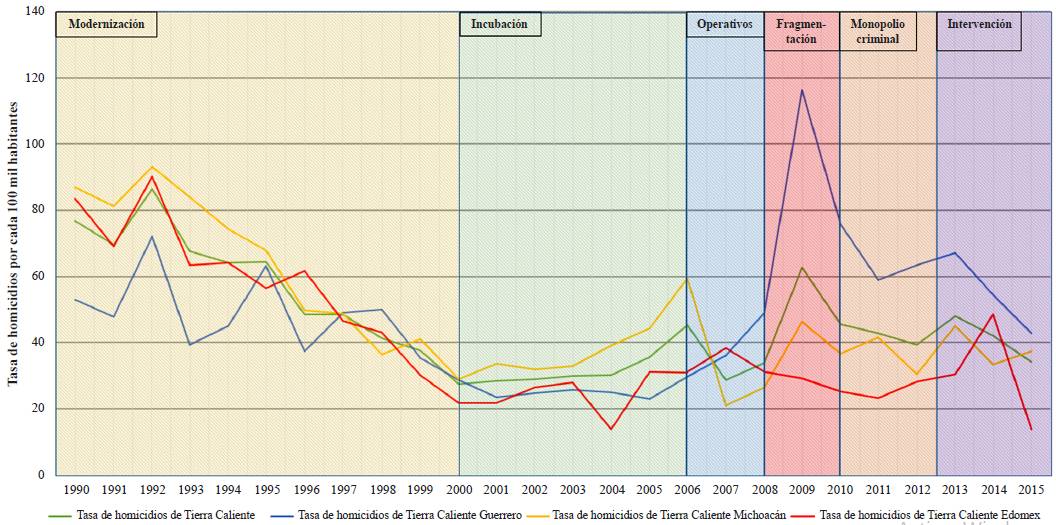 Por otro lado, la gráfica 2 muestra que 2014 fue especialmente violento en el Estado de México, probablemente debido al conflicto entre Guerreros Unidos y Caballeros Templarios en esa entidad, lo cual llevó a una fuerte militarización que precedió las ejecuciones extrajudiciales cometidas por el Ejército en Tlatlaya (CNDH, 2014). No se debe perder de vista que la tasa de homicidios se estabiliza a la baja en Michoacán entre 2010 y 2012, periodo en que el gobierno estatal y los municipales fueron capturados en un acuerdo político entre el gobernador Fausto Vallejo y los Caballeros Templarios (CNDH, 2015). En suma, aunque hay patrones de violencia diferenciados en Tierra Caliente, están interrelacionados y obedecen, en buena parte, al conflicto del Estado con las organizaciones criminales, así como a diferentes fenómenos históricos. Por esa razón, en la gráfica 2 se hace una periodización relacionada con los fenómenos que probablemente expliquen las tendencias del homicidio en la región: la modernización, la incubación del conflicto entre organizaciones criminales, los operativos federales, la fragmentación de las organizaciones criminales a raíz de la política de detenciones, la predominancia de los Caballeros Templarios y la intervención que realizó el gobierno federal en la región hasta 2015.
