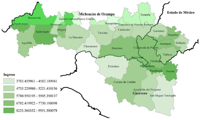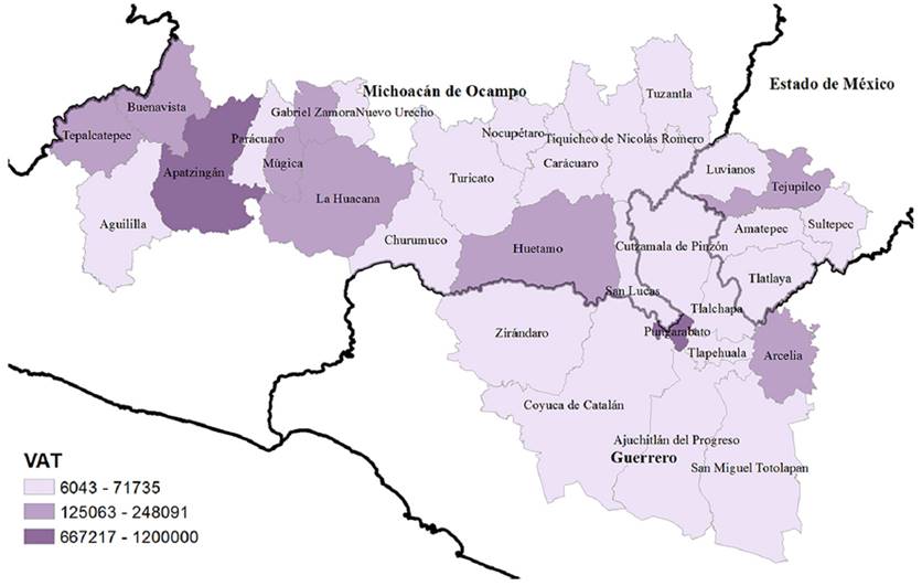 Como lo ha puesto de relieve Maldonado Aranda (2010), esta ha sido una zona endémicamente violenta y con presencia relevante de organizaciones criminales. En años recientes recibió atención mediática por el alzamiento de grupos de vigilantes (mejor conocidos como autodefensas), por lo que cabe apuntar que se ha encontrado que la desigualdad en el ingreso es significativa para explicar el alzamiento según Phillips (2016). Las autodefensas se movilizaron contra las condiciones predominantes impuestas por los Caballeros Templarios y la cooptación de gobiernos locales y municipales de Michoacán. También ha sido una región con masivo desplazamiento interno forzado (en San Miguel Totolapan) y ejecuciones extrajudiciales por parte de las Fuerzas Armadas (Tlatlaya). Igualmente, la cercanía con el puerto de Lázaro Cárdenas, la producción agroindustrial de limón, aguacate y papaya en Michoacán y Guerrero, la minería en la sierra michoacana, y la alta migración y marginación, articulan la Tierra Caliente como epicentro de la actividad económica de ambas entidades (Maldonado Aranda, 2012; Bustamante, León López & Terrazas Mata, 2000; García-Ponce & Lajous, 2014). Por estas razones, es una región propicia no sólo para estudiar la actividad criminal y la violencia, sino también la desigualdad y el desarrollo económico, con el aliciente de que su homogeneidad rural y lenta urbanización permiten observar estos fenómenos de manera simultánea, justamente para verificar que se podría generar desorganización social y anomia por los procesos inacabados de industrialización y urbanización.