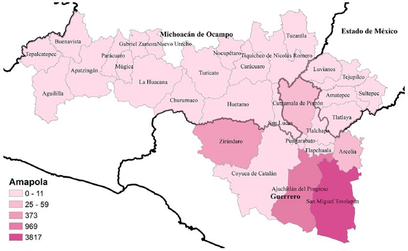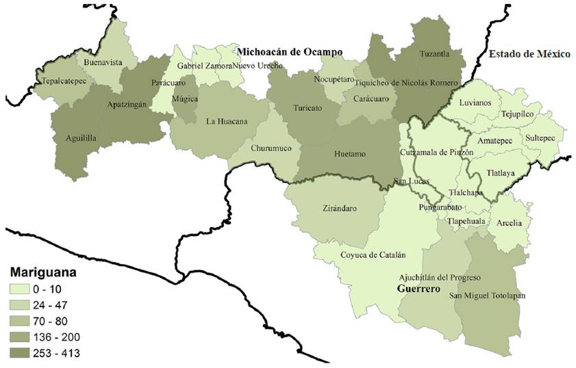 Ahora bien, si se pone atención especial al resto de los modelos, además de las variables mencionadas, hay otras también significativas que merecen un comentario. Desde la perspectiva de los mercados ilegales y la acción gubernamental, las armas largas, la coordinación intergubernamental, la Familia Michoacana y el cártel de los Beltrán Leyva, la erradicación de hectáreas de mariguana y amapola, y las sentencias por homicidios, ponen de relieve un complejo esquema de interacción entre mercados legales e ilegales, además de competencia entre organizaciones criminales. Parecería que la coordinación ayudaría a bajar la tasa de homicidios, al igual que la presencia sin competencia de la Familia Michoacana. El número de policías muestra el control relativo de esta organización y, por lo tanto, la baja competencia que tenía en municipios de Michoacán. En cambio, los Beltrán Leyva y sus organizaciones sucesoras en Guerrero muestran un escenario de competencia violenta. Igualmente, acciones gubernamentales concretas, como las sentencias por homicidios y el michoacanazo, parecen haber causado reacciones feroces que afectaron la tasa de homicidios. Es particularmente notable que donde hay hectáreas de mariguana y amapola, hubo reducción de la tasa de homicidios, lo cual probablemente signifique que las organizaciones criminales no suelen enfrentarse en regiones donde hay producción para los mercados ilegales. Muestra de ello es la diferencia entre municipios con altas tasas de homicidio y aquellos que tienen sembradíos de mariguana y amapola, como se observa en los mapas 3, 4 y 5.