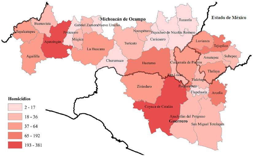 Por eso, con el fin de tener un análisis robusto desde ambos campos de la literatura y con énfasis en una región diferente a la frontera norte (estudiada más frecuentemente), escribo desde una perspectiva regional. Igualmente, algunas variables relevantes para examinar los municipios de la frontera no necesariamente podrían ser útiles para explicar lo que sucede en el sur. Como lo notó Fernando Escalante (2009), la violencia homicida en México se ha concentrado predominantemente en diversas regiones articuladas con zonas fronterizas o costeras, a saber, la frontera con Estados Unidos, el Golfo y el Pacífico. No es sorprendente notar esta distribución, ya que las organizaciones criminales requieren de redes de protección para acceder a los mercados ilegales internacionales mediante carreteras y puertos. En este caso, se tratará de una región del país que Escalante identifica como la cuenca del río Balsas, que es cultural e históricamente conocida como Tierra Caliente.