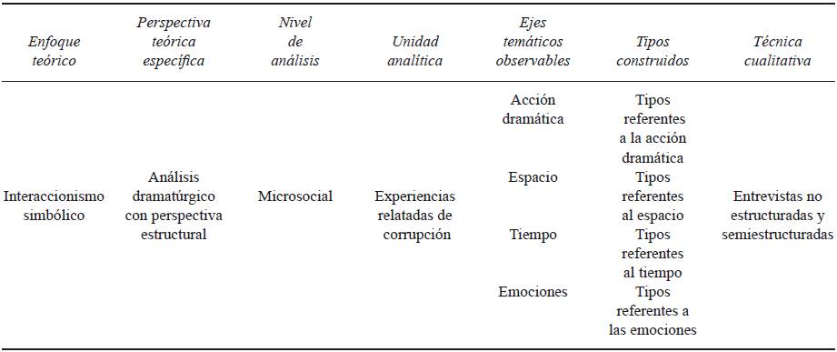 El modelo de análisis se construyó tomando en cuenta los trabajos sobre corrupción de Boniolo (2009, 2010), la propuesta del análisis narrativo de Labov y Waletzky (1967) y el análisis dramatúrgico de Goffman (1951, 1956, 1959, 1967, 1971, 1975). Boniolo estudió las prácticas y representaciones sociales de la corrupción en dos clases sociales: la media de cuello blanco y la trabajadora obrera, y para ello la autora resaltó el elemento del espacio, el tiempo, la distancia social y las definiciones de corrupción entre los entrevistados. Por su parte, Labov y Waletzky construyeron un modelo que puede analizar cualquier experiencia anecdótica ocurrida en el pasado. Sus aportes a esta investigación se condensan en la observación de las emociones y la explicitación de las secuencias de las acciones. De las aportaciones de Goffman se tomaron algunas contribuciones teóricas para crear las categorías observables del modelo de análisis elaborado -como la acción dramática, el espacio y las emociones-, pero también para la descripción analítica del material empírico organizado, es decir, para la utilización de conceptos de corte dramatúrgico, cuyo objetivo es la comprensión microsocial de las experiencias relatadas de corrupción.