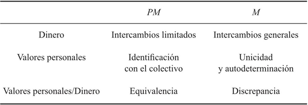 De manera resumida, se distinguen las siguientes combinaciones entre los valores personales y el dinero. La última columna caracteriza a la modernidad (M), mientras que la anterior al dinero y el hombre premodernos (PM):
