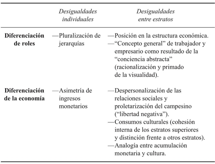 Consecuentemente, desde este otro ángulo gana terreno el dualismo diferenciación-desigualdad: la autonomización de la economía monetaria no permitiría entender las asimetrías sociales en términos de estratificación, haciendo que el análisis de la desigualdad se diluya en la circularidad y las infinitas situaciones individuales.
