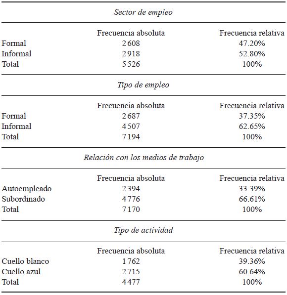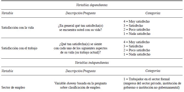 Sector de empleo (formal/informal): para categorizar a los individuos según esta dimensión se utilizó la variable original sobre clasificación del empleo que divide a la empresa donde labora cada encuestado en “independiente o familiar”, “empresa del sector privado”, “institución de gobierno” o “institución no gubernamental”, dependiendo del caso. Para este artículo se consideró que el sector informal de la economía está compuesto por empresas “independientes, personales o familiares”, mientras que los que respondieron trabajar en cualquiera de las otras tres categorías componen el sector formal. Esta operacionalización es congruente con la de la OIT (2013).