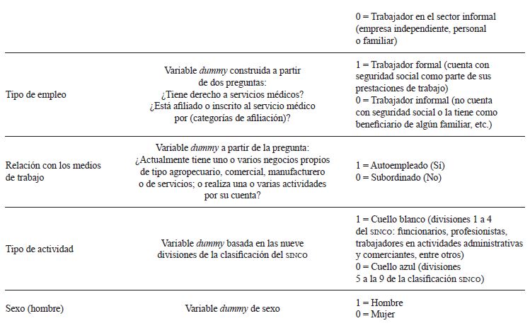 Tipo de empleo (formal/informal): las categorías se construyen a partir de la pregunta en el BIARE acerca de si el individuo goza o no de seguridad médica y social como parte de su relación laboral,10 y otra pregunta sobre el estatus de afiliación a institutos de seguridad social.11 Se dividió a los encuestados en formales, aquellos que cuentan con seguridad social como parte de sus prestaciones laborales; e informales, los que no cuentan con seguro médico, o lo tienen, pero por alguna otra razón no relacionada con su trabajo. Esta operacionalización es congruente con la de la OIT (2013).