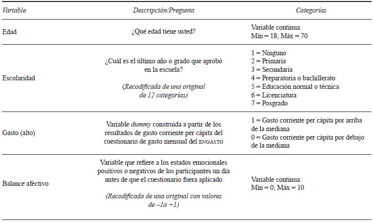 En todos los casos utilizamos como controles las variables sexo, edad, nivel de instrucción, gasto14 y balance afectivo.15 Esta última variable, el balance afectivo, se refiere al resultado de los estados emocionales positivos o negativos de los participantes un día antes de que el cuestionario fuera aplicado; es decir, su estado de ánimo en el momento coyuntural de ser entrevistados.